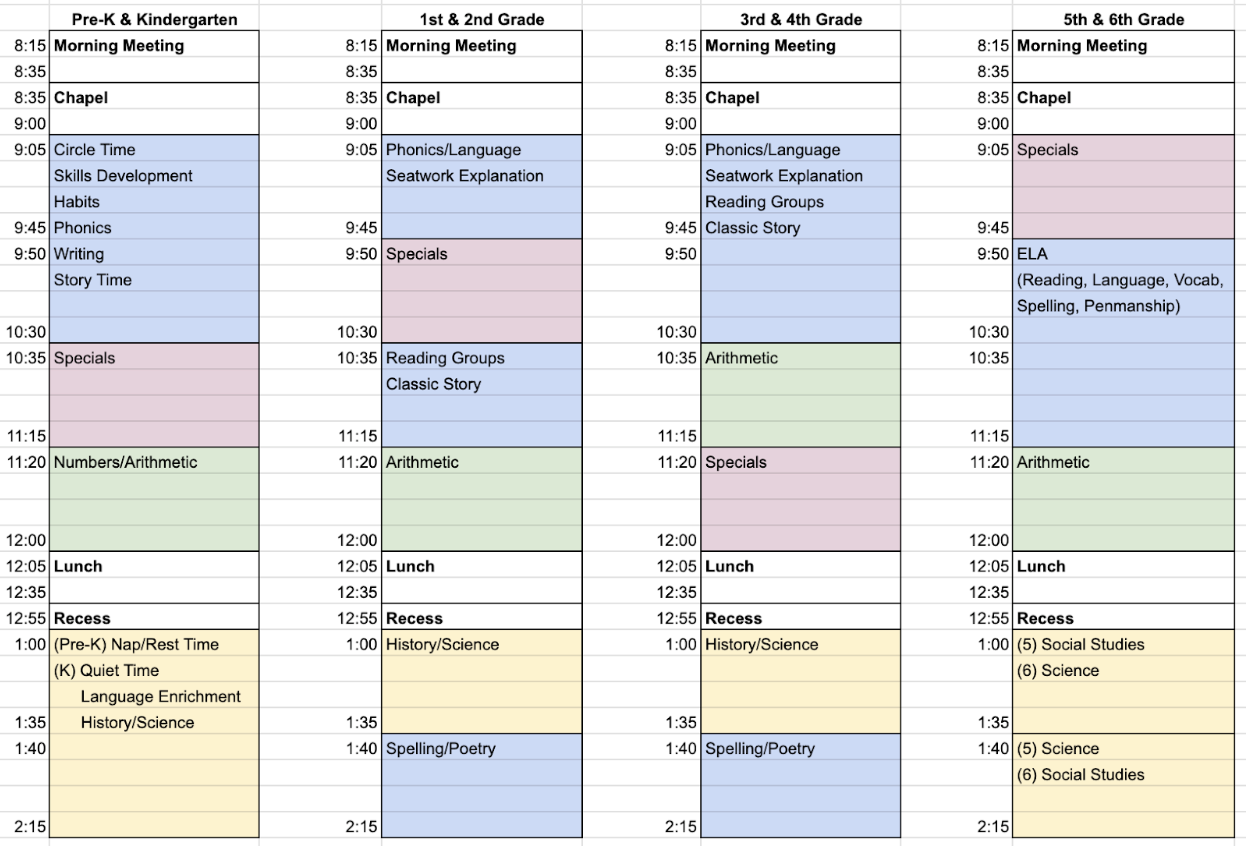 Bible is a core focus at every grade level. Students memorize scripture, study biblical characters and narratives, learn doctrine appropriate to their age, and apply biblical principles to daily life. Our goal is not just biblical knowledge but heart transformation and character development.